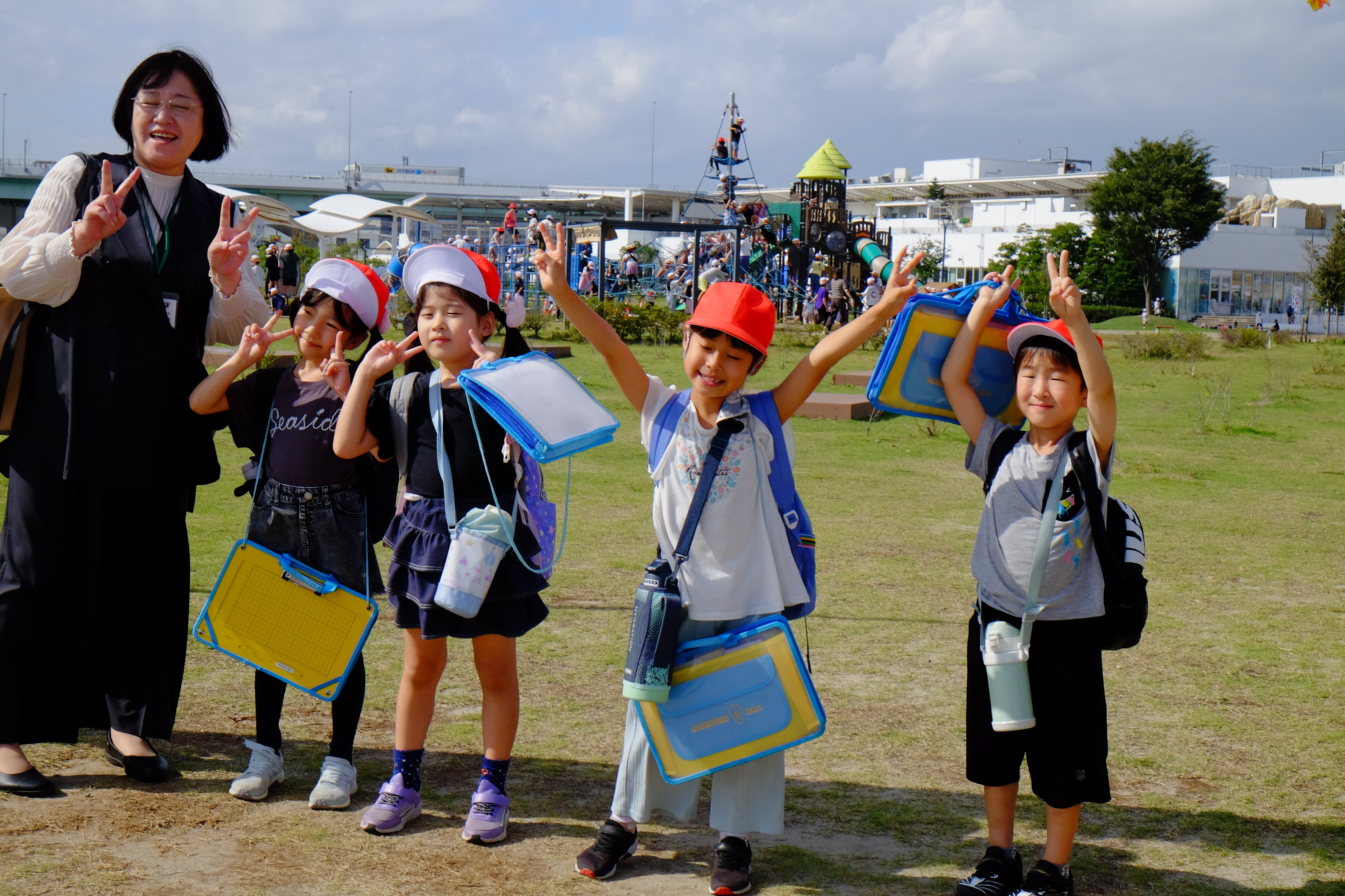 お弁当はうみの杜水族館隣の高砂公園で1・2年生みんな一緒に食べました。