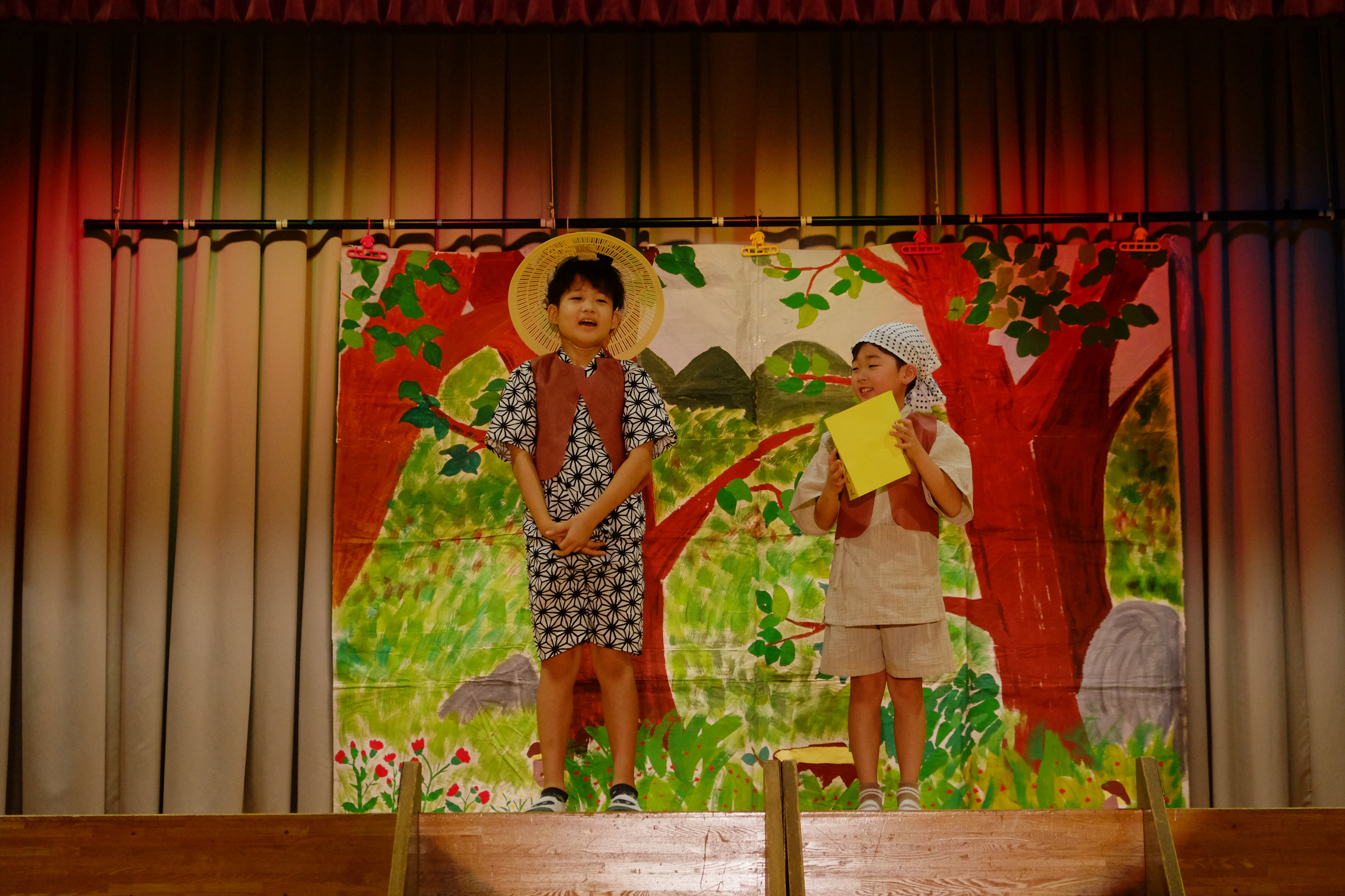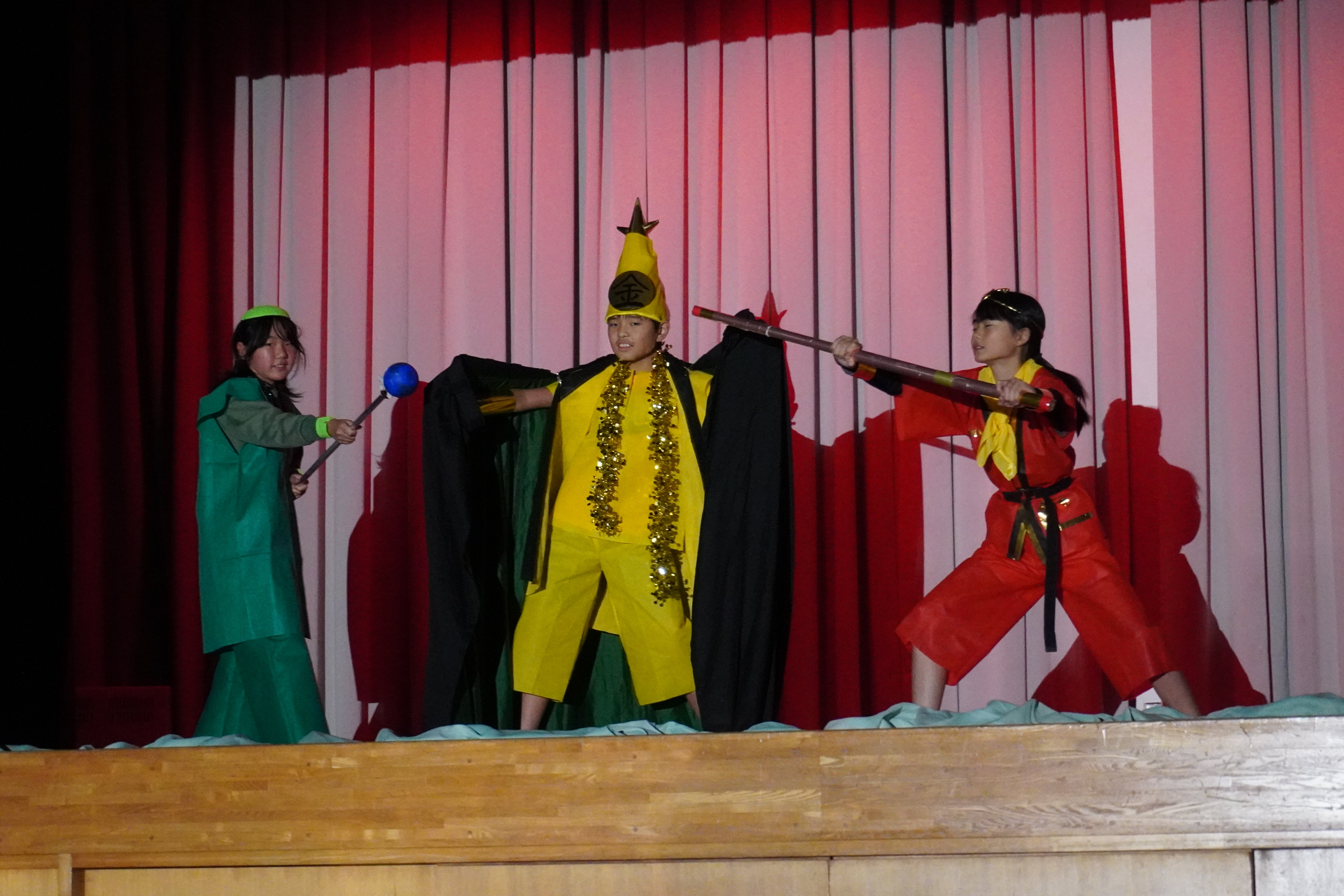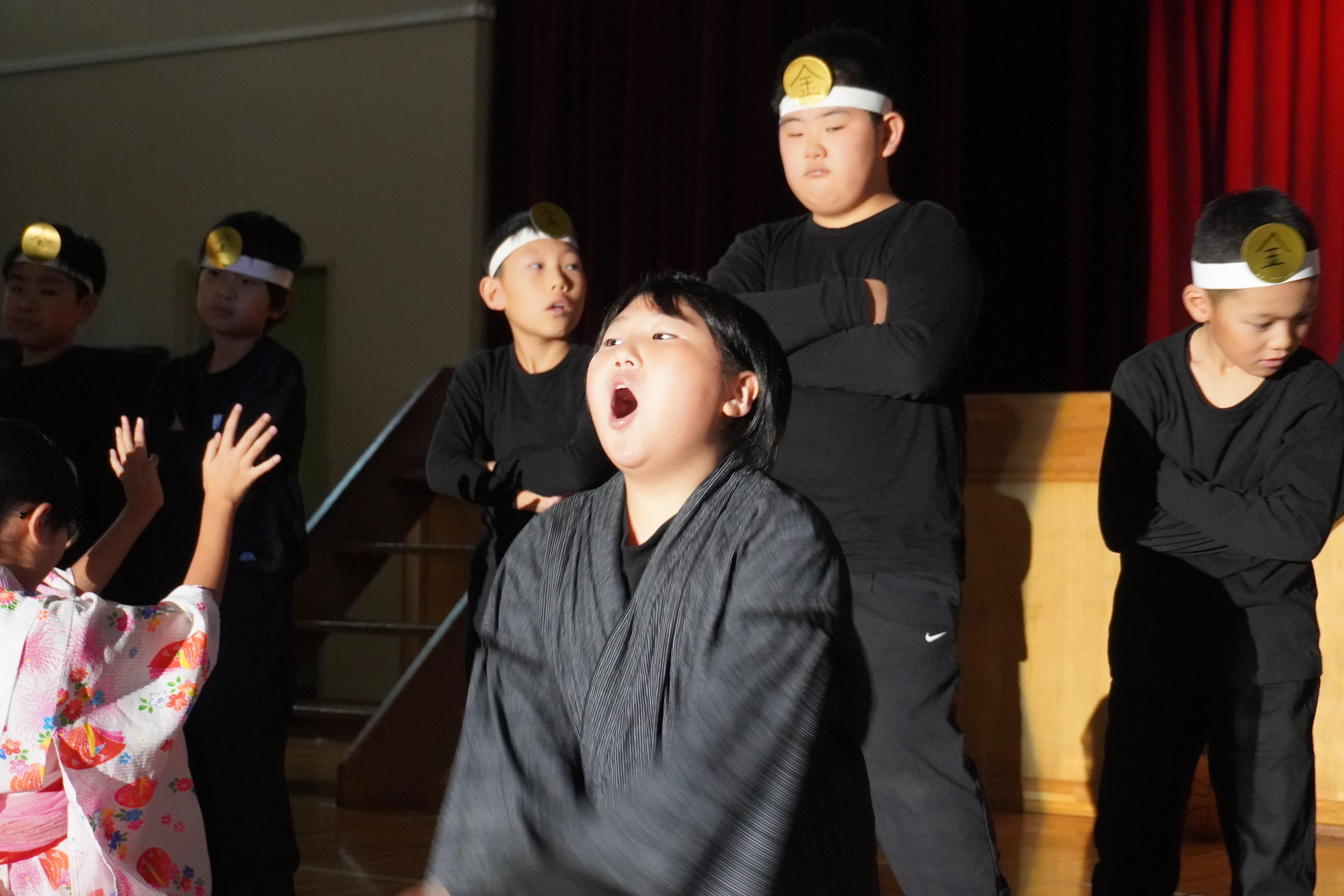1~3年生は、ごんべえとどんべえが鬼との3番勝負を行う劇「おにの3ばんしょうぶ」を行いました。