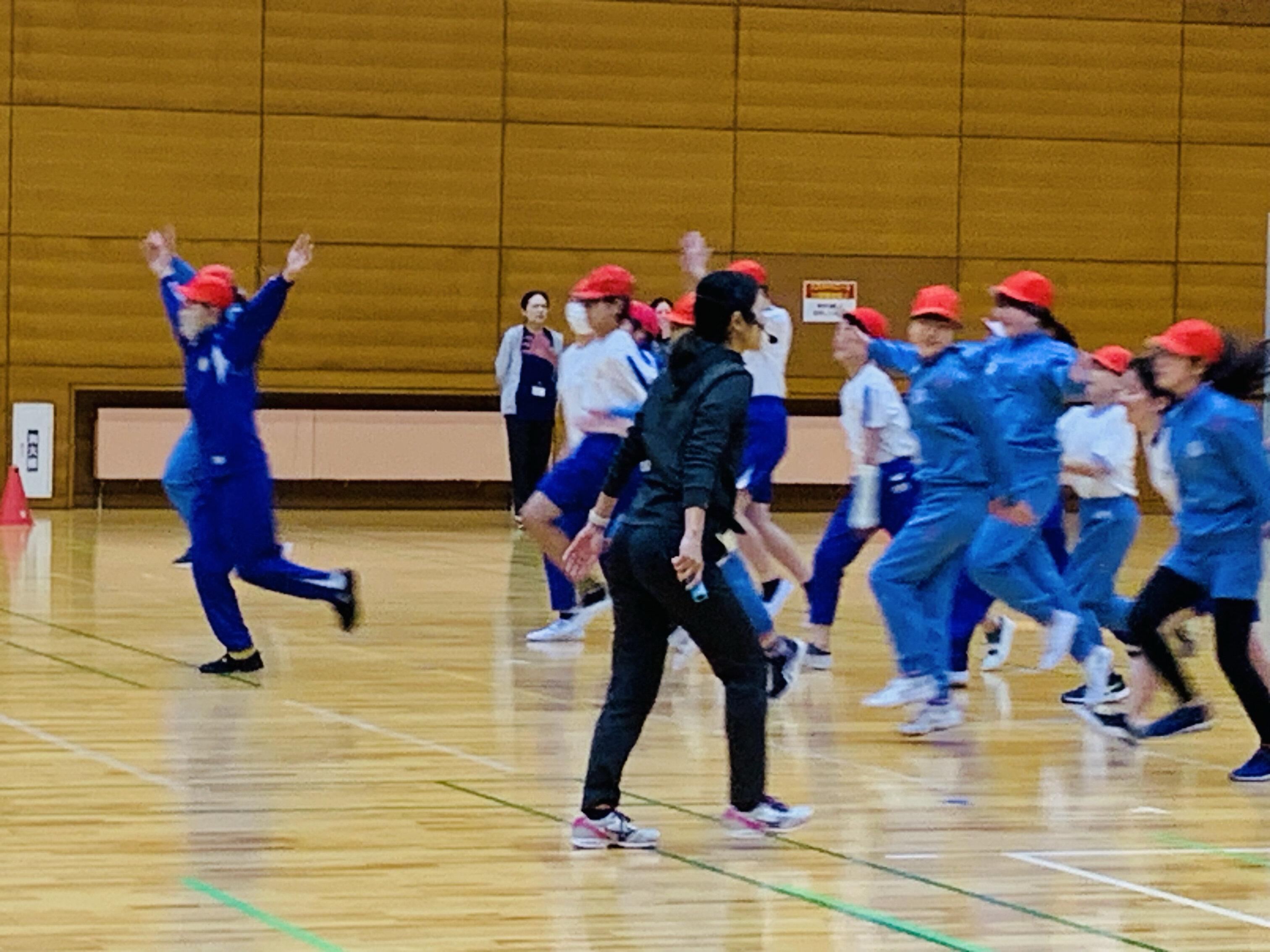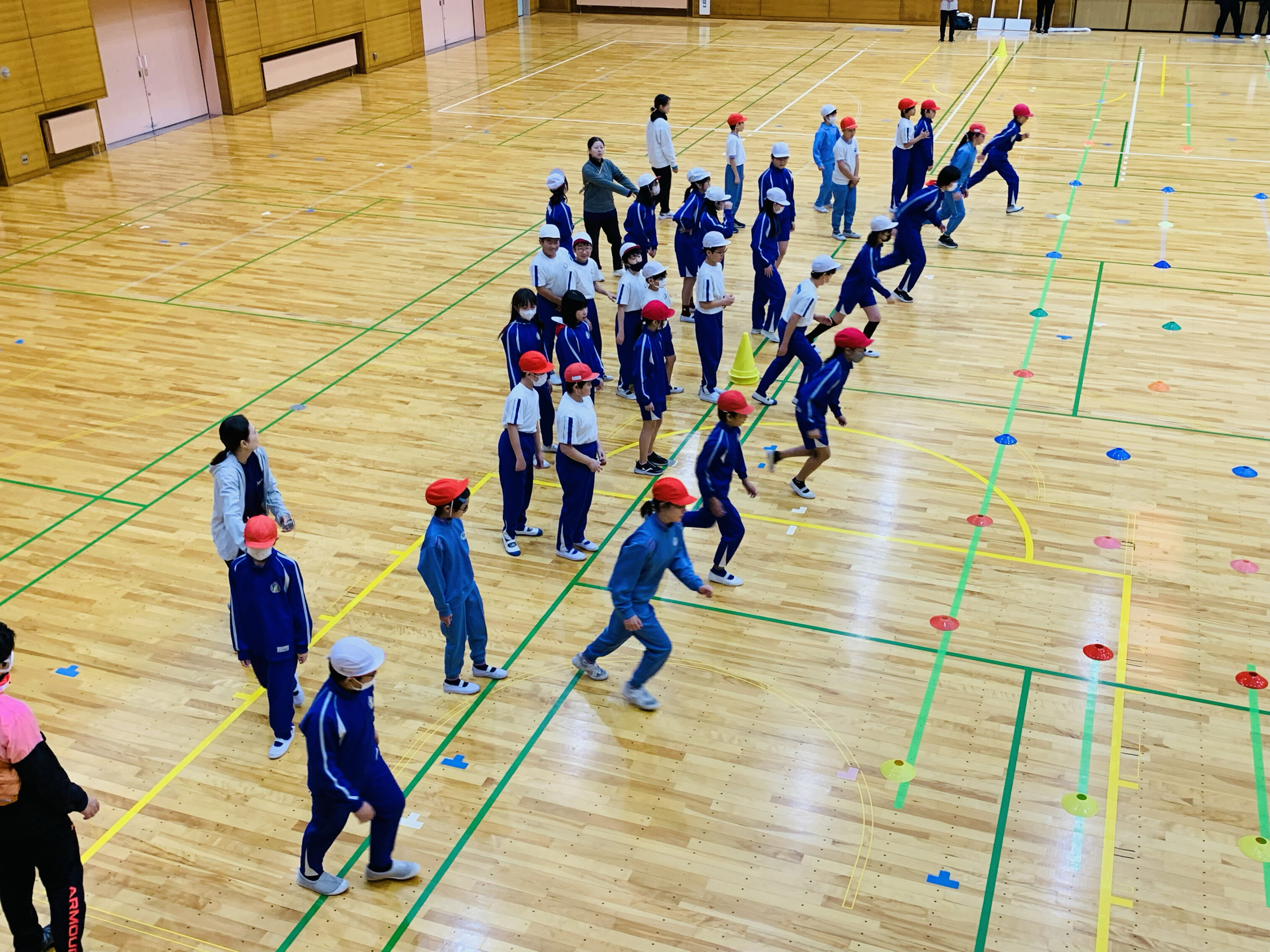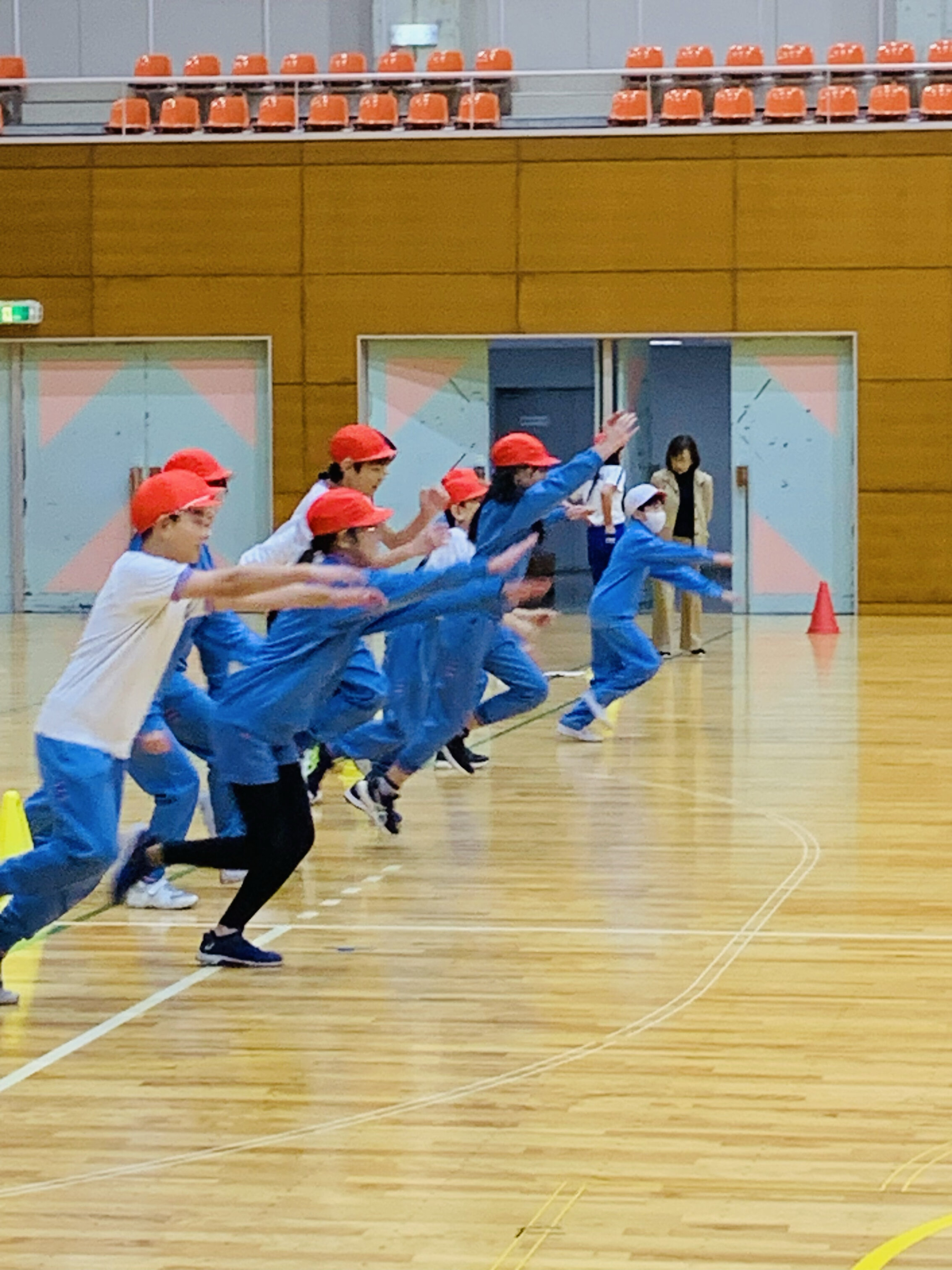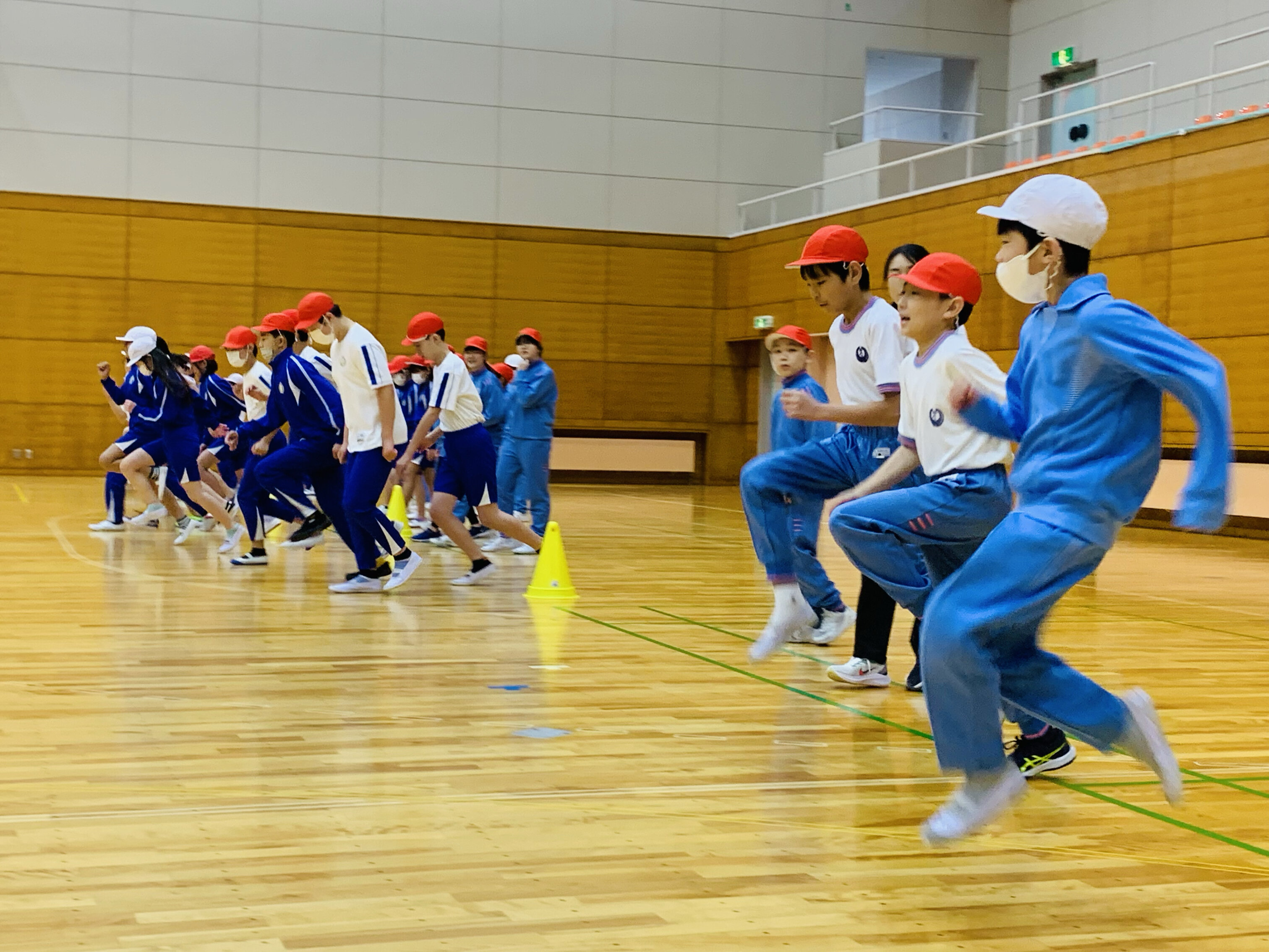 大和アカデミーから講師の先生をお招きし、速く走れるようになるためのポイントを教えていただきました。陸上教室では、スキップや足でじゃんけん、変形ダッシュの競争などの活動を行いました。