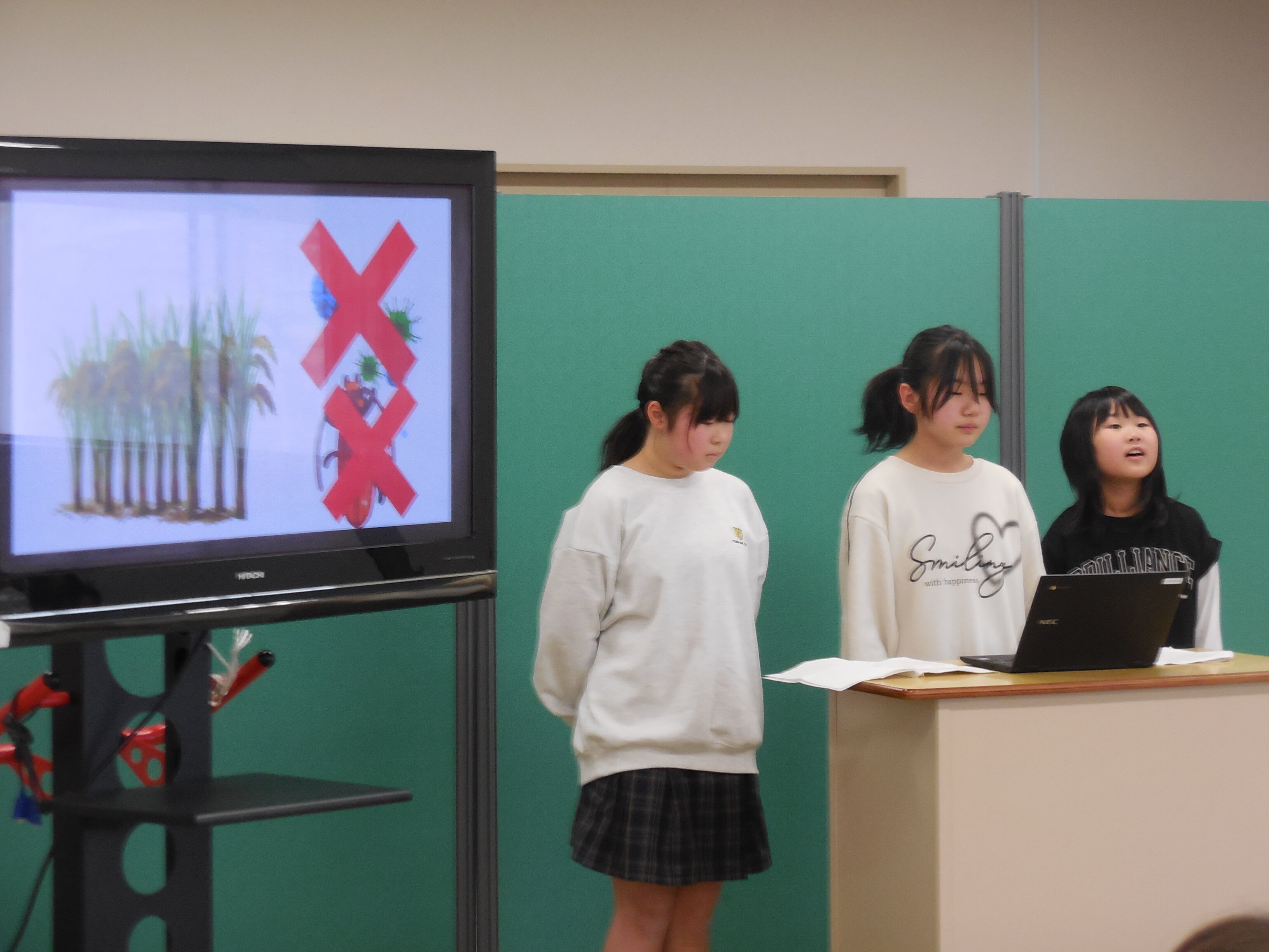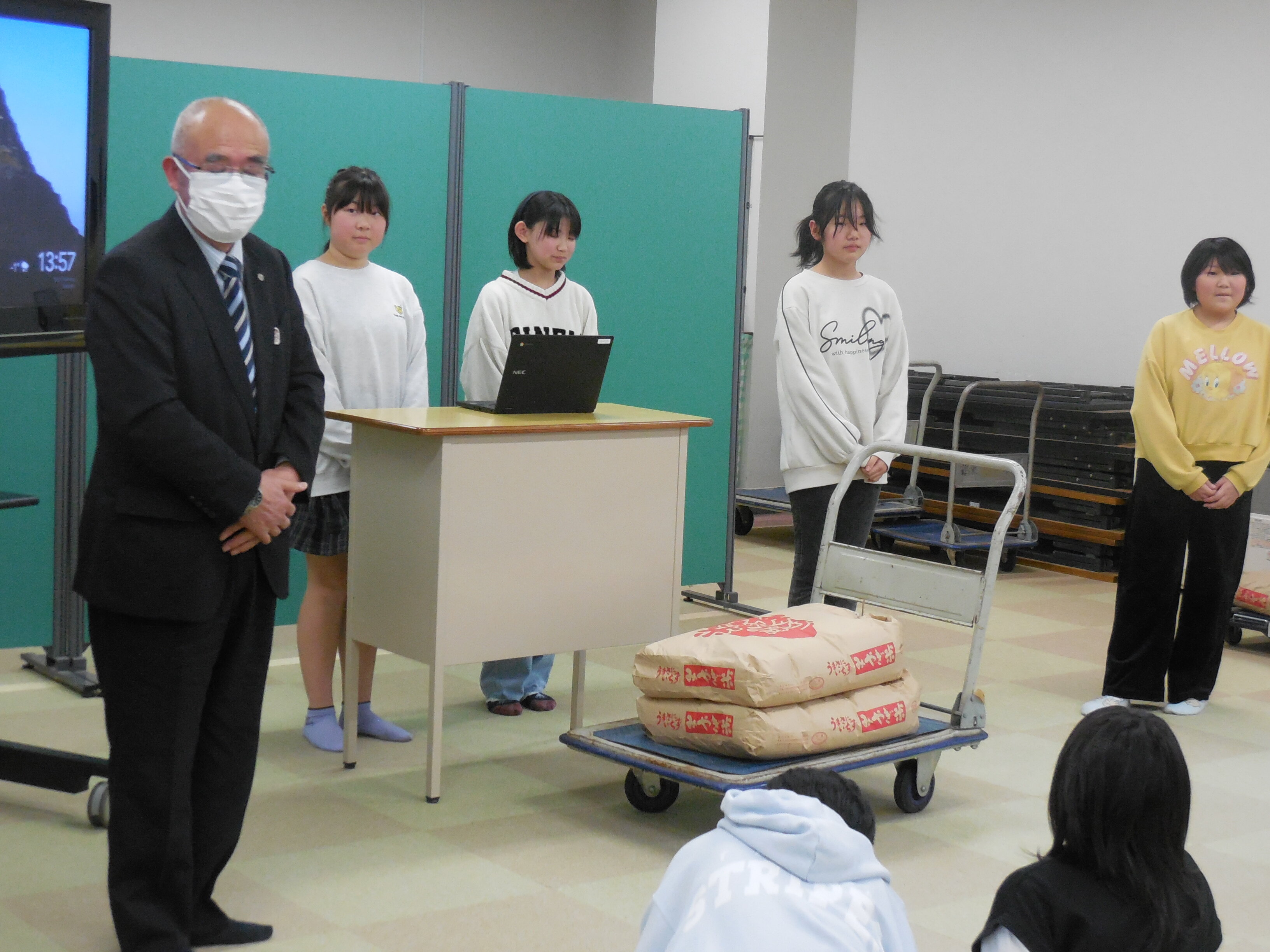 5年生は、夢田んぼでの米作りのことについて振り返り、米作りについての提案もスライドにまとめて発表しました。