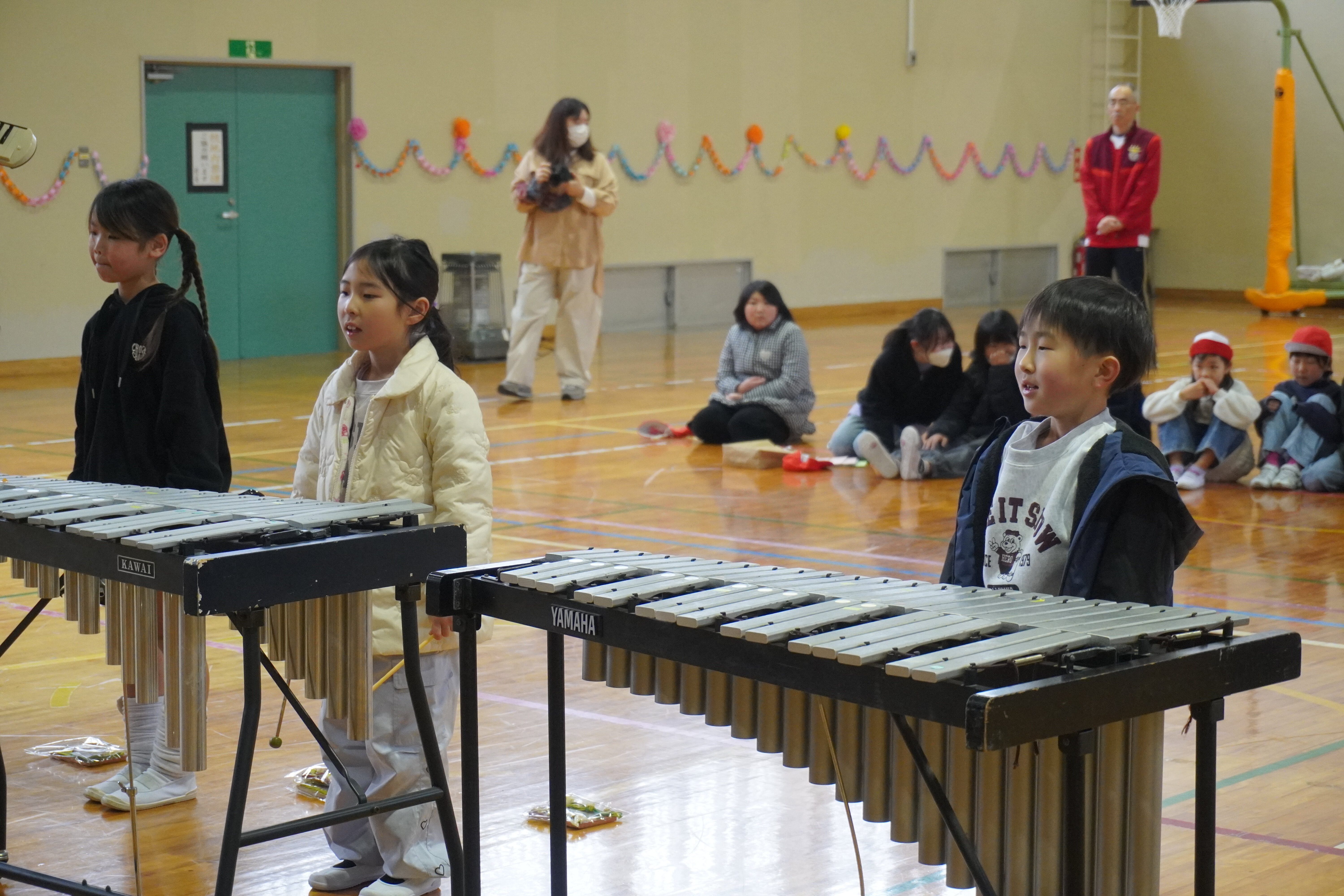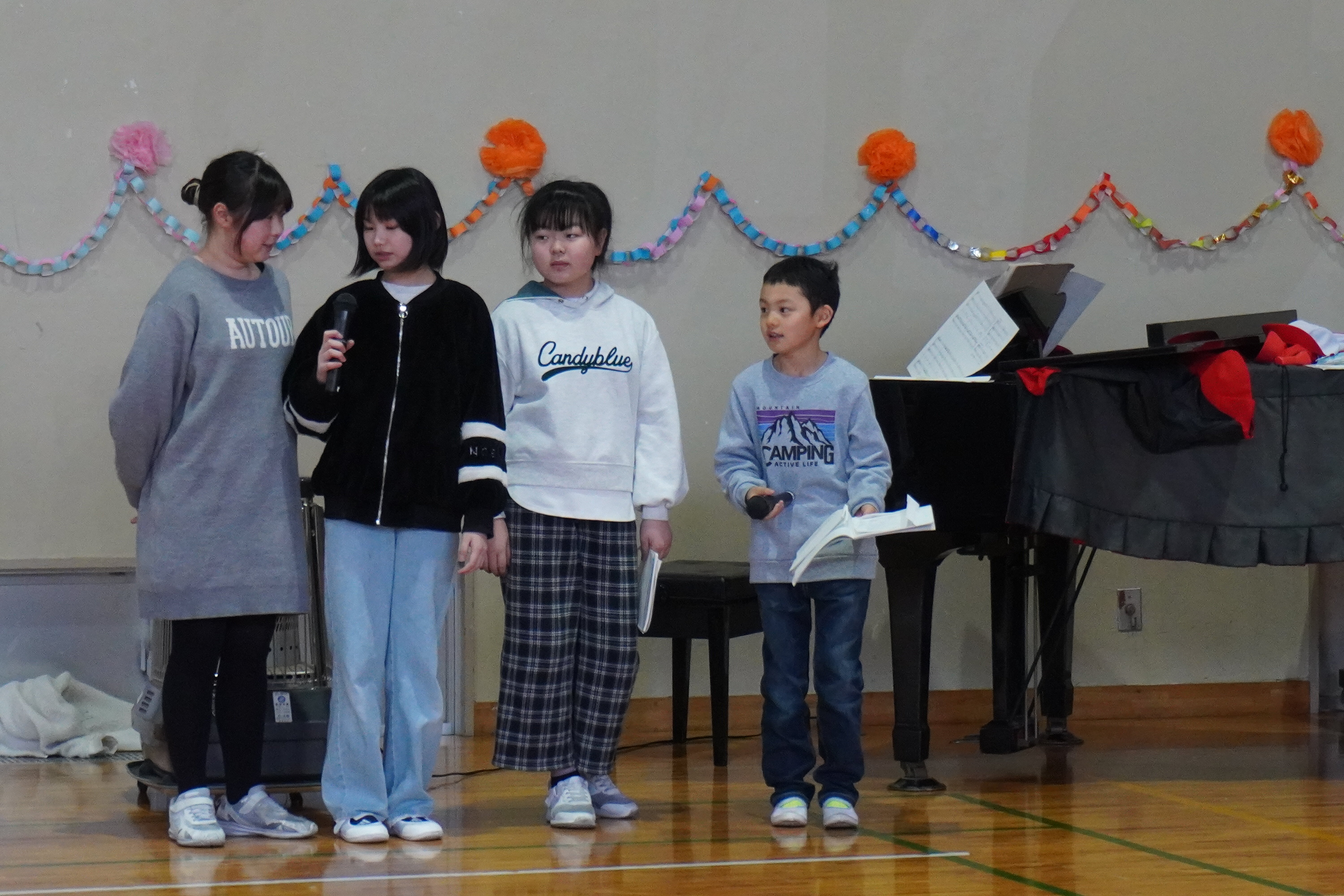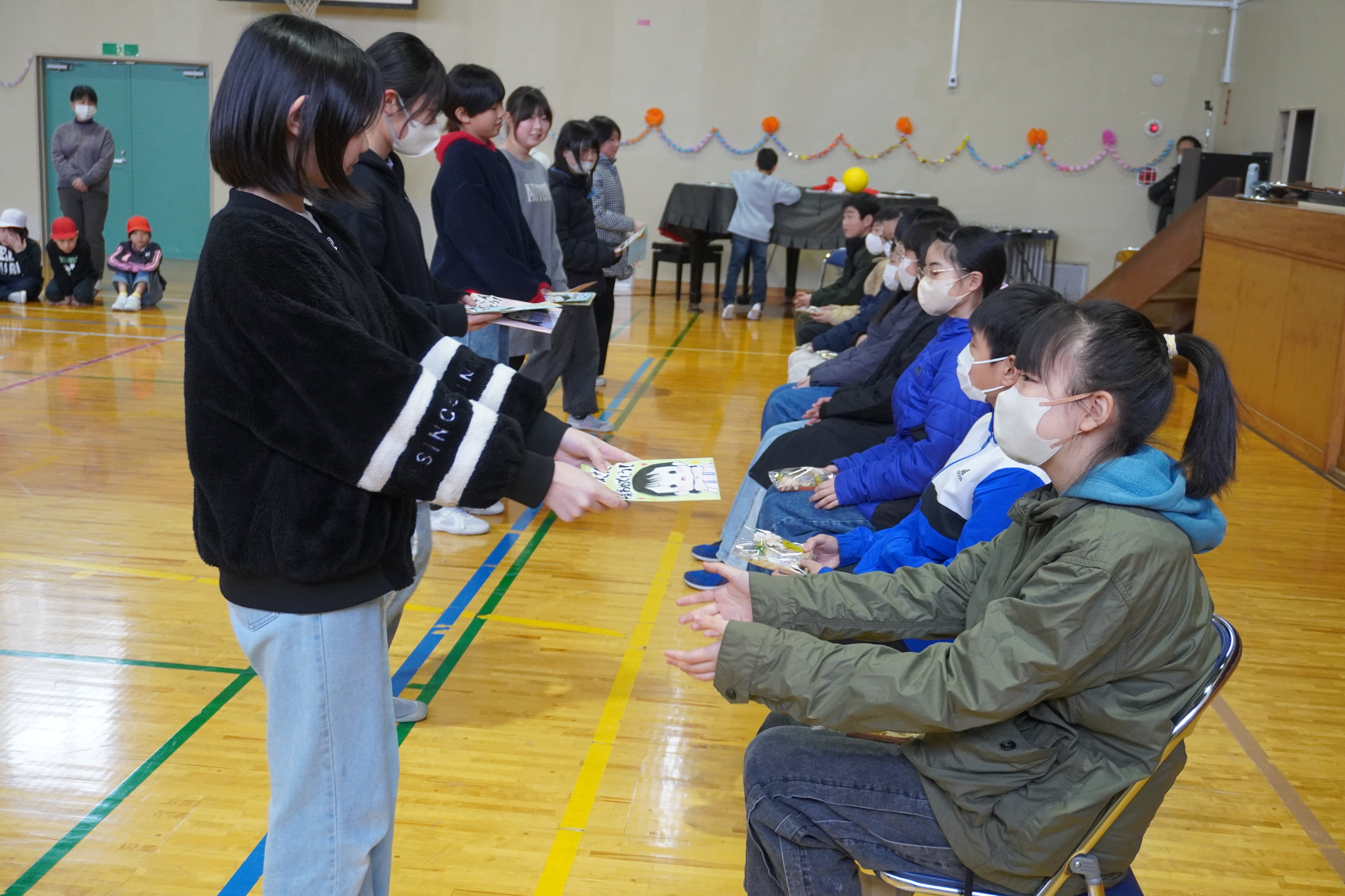 1・2年の皆さんから、写真立てと「エルクンバンチェロ」という曲の合奏、5年生の皆は、全校児童のメッセージをプレゼントしました。