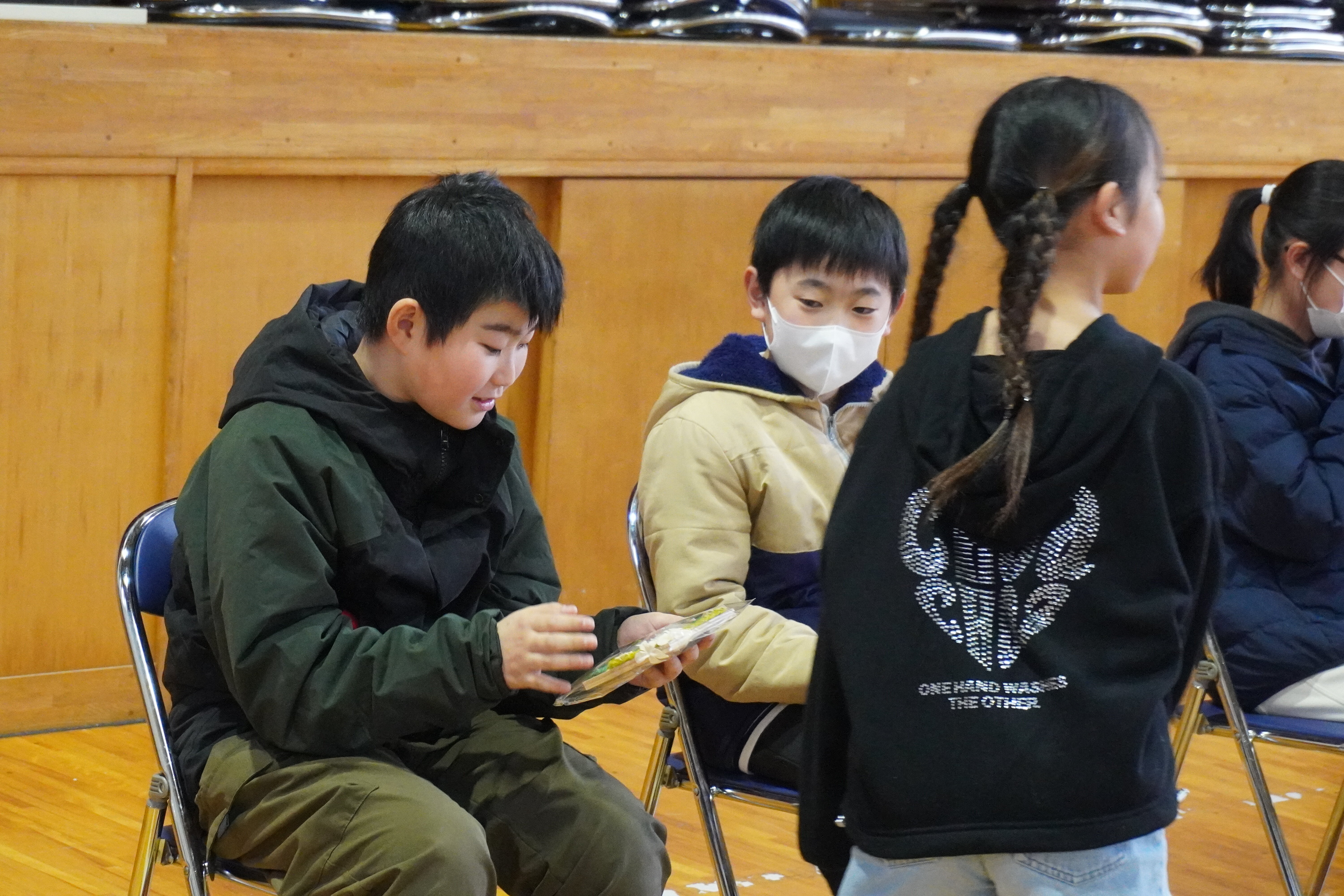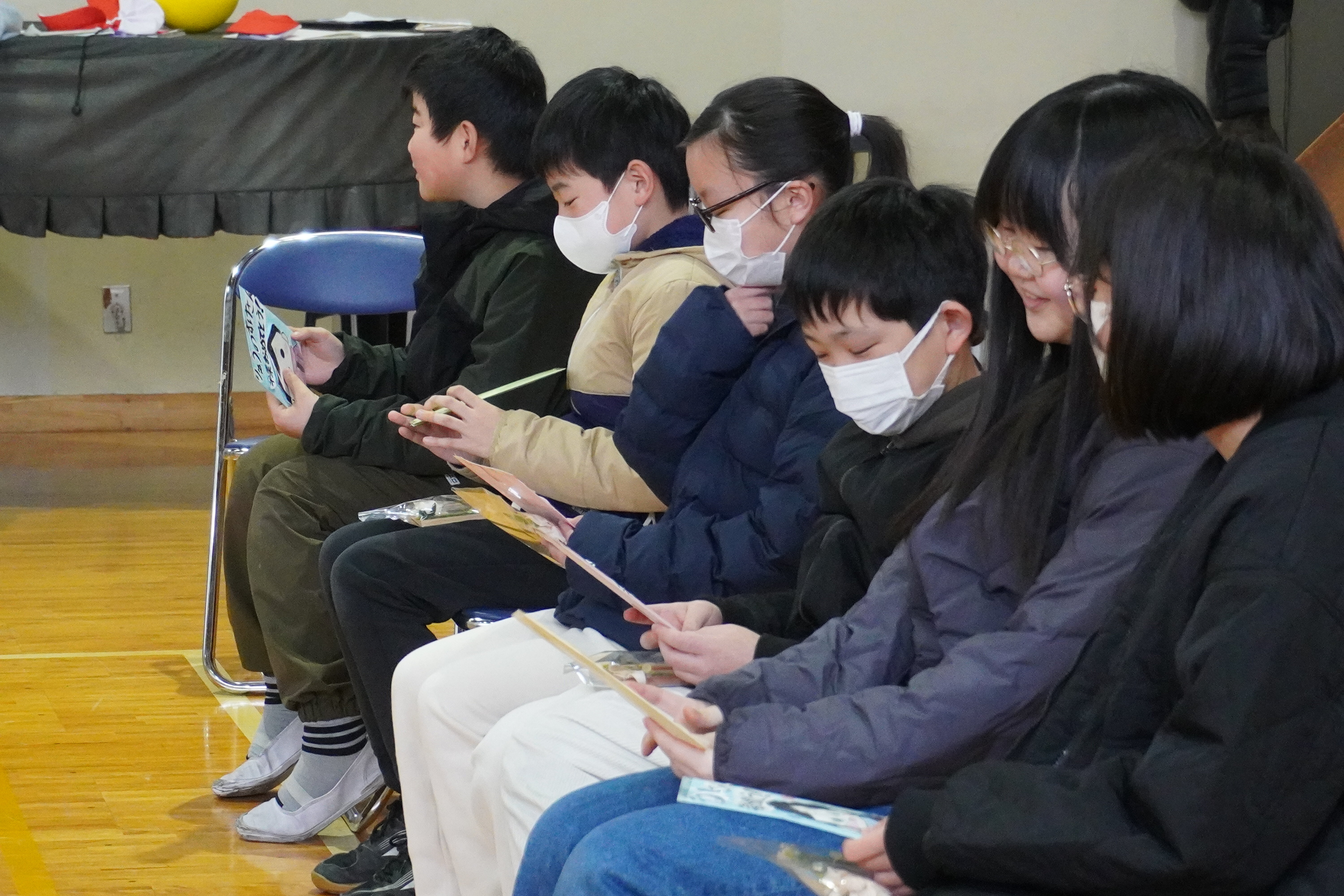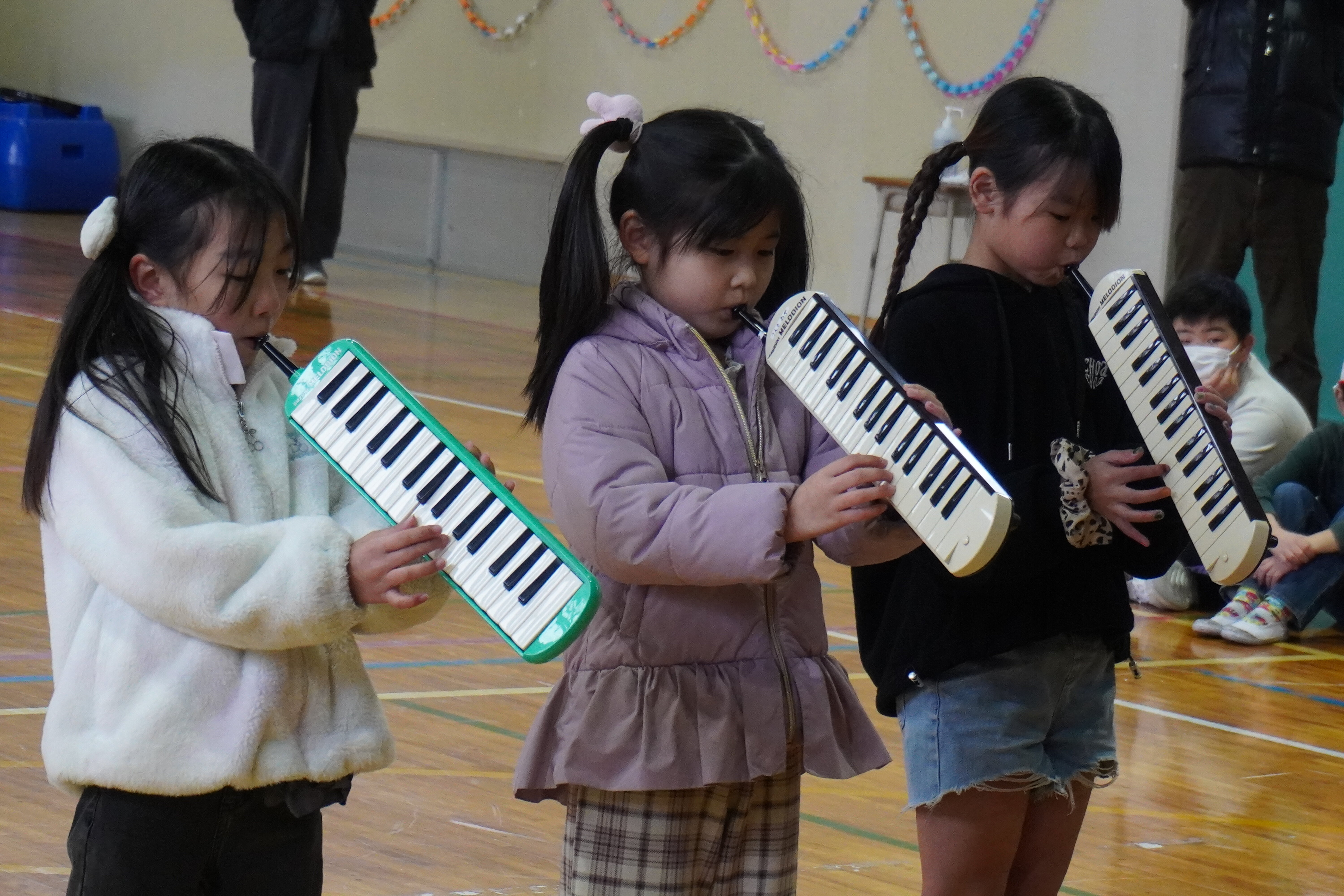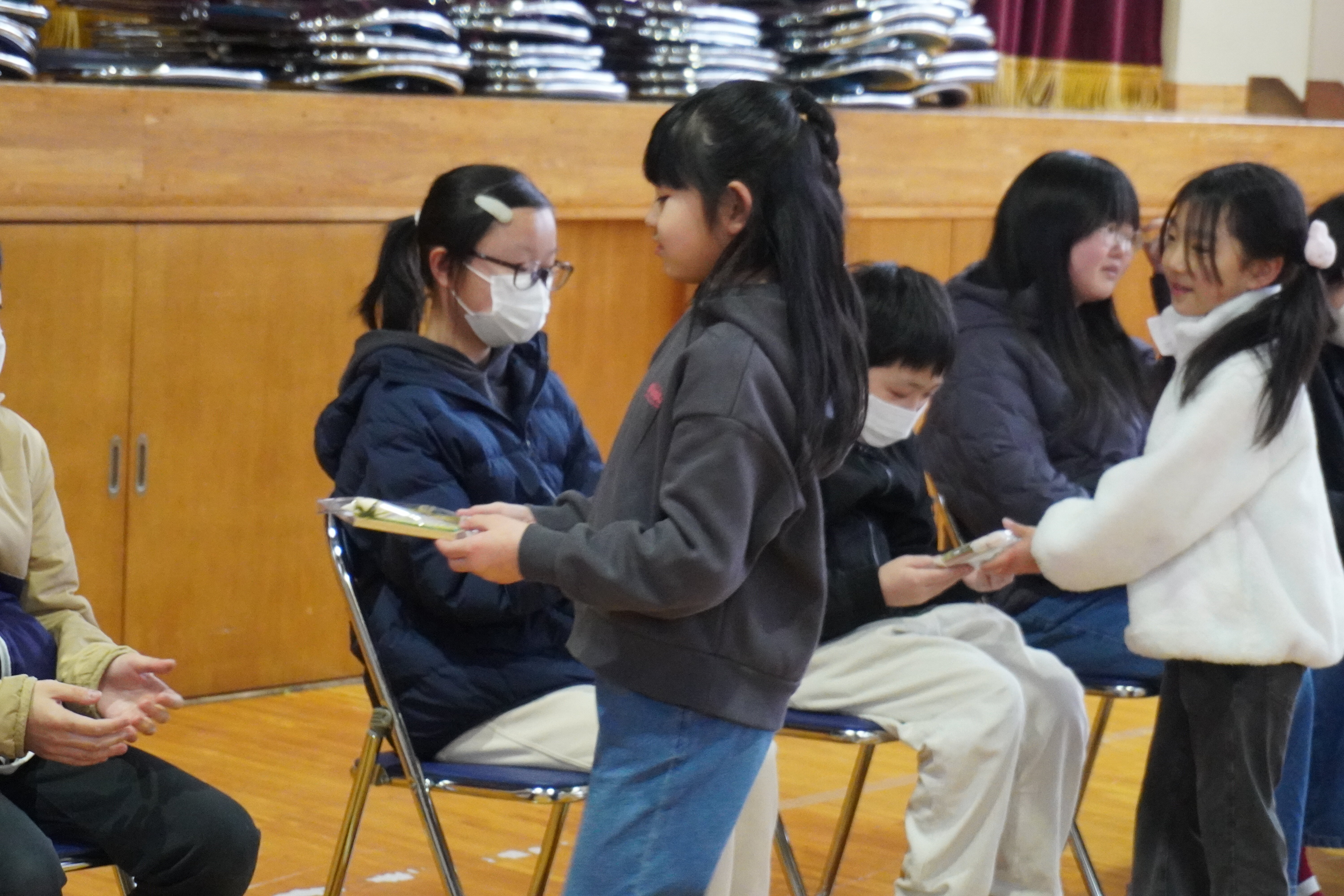 1・2年の皆さんから、写真立てと「エルクンバンチェロ」という曲の合奏、5年生の皆は、全校児童のメッセージをプレゼントしました。